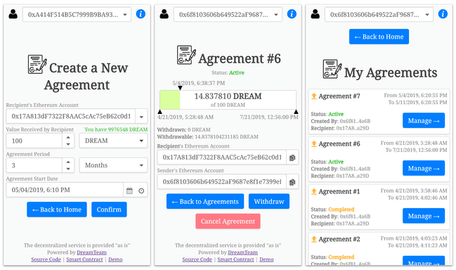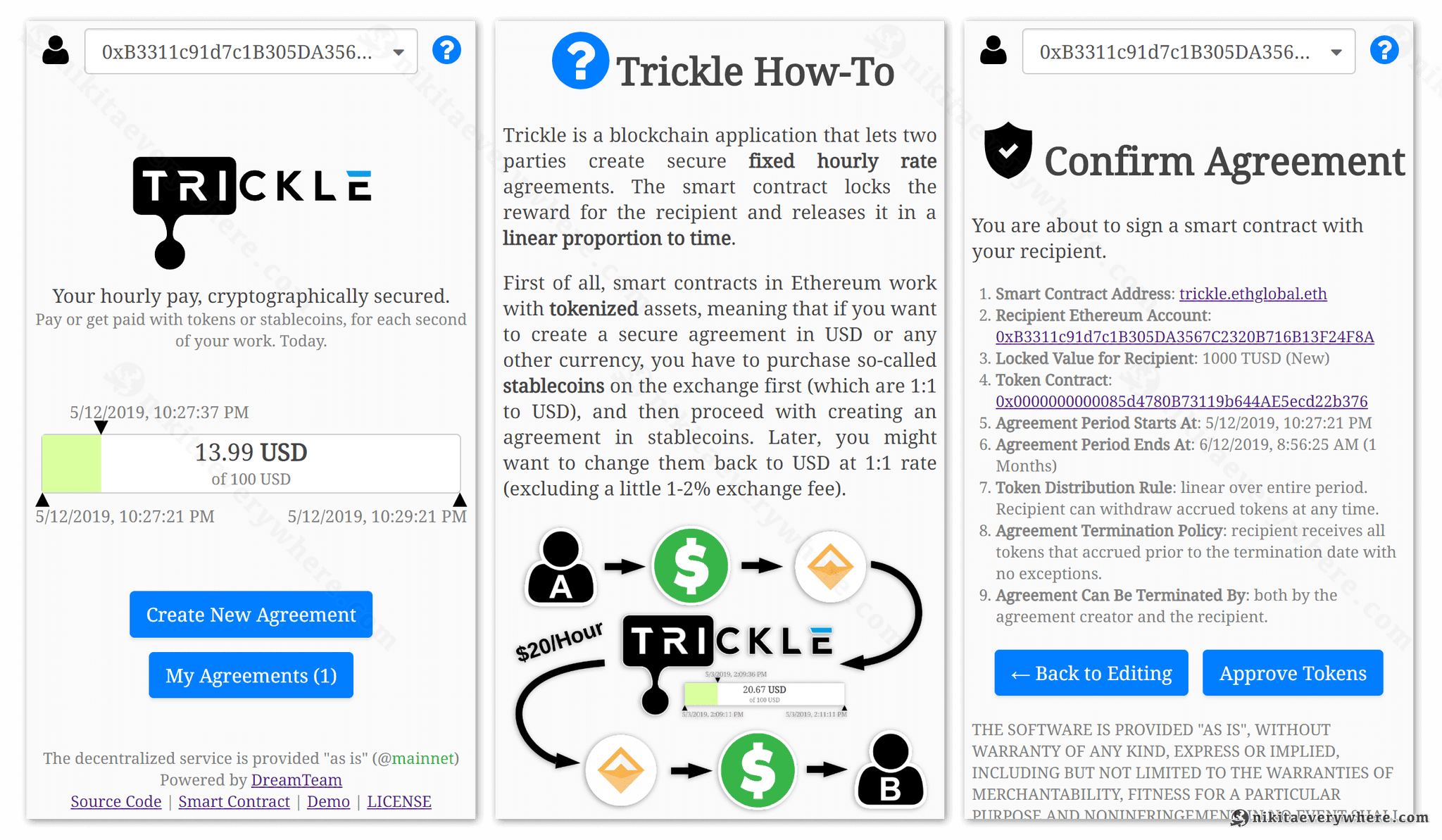 Trickle is a blockchain application that lets two parties create secure fixed hourly rate agreements. The smart contract locks the reward for the recipient and releases it in a linear proportion to time. Trickle works with any stablecoin or ERC20-compatible token on top of Ethereum network.