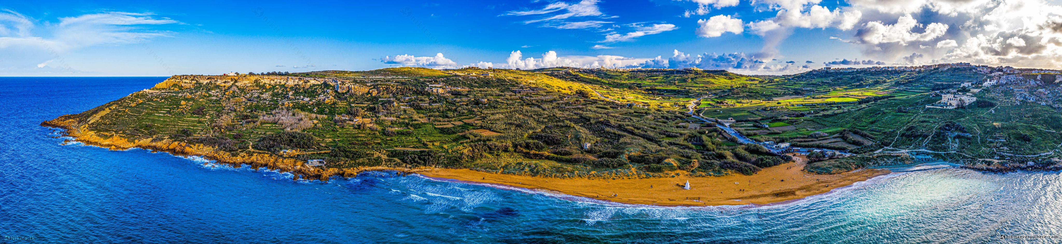 The drone captured Malta's archipelago from above in sweeping panoramas. Over Gozo, the golden-red sands of Ramla Bay curve beneath terraced farmland stretching to the horizon. The island's coastline reveals dramatic limestone cliffs, hidden coves, and the deep blue Mediterranean stretching endlessly around these ancient islands.