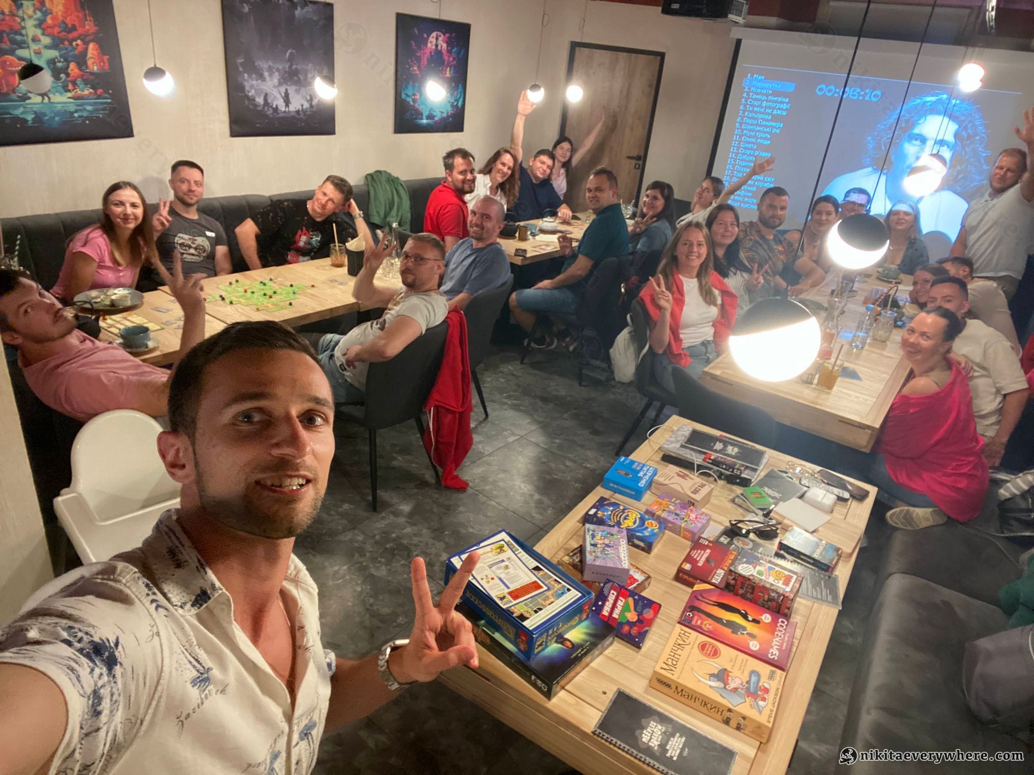 The workflow was straightforward: we'd gather at 4pm, start with 1–2 hours of a warmup game that works well with large groups - usually Codenames projected on the big screen. Then we'd break down by tables and play various games until late evening.